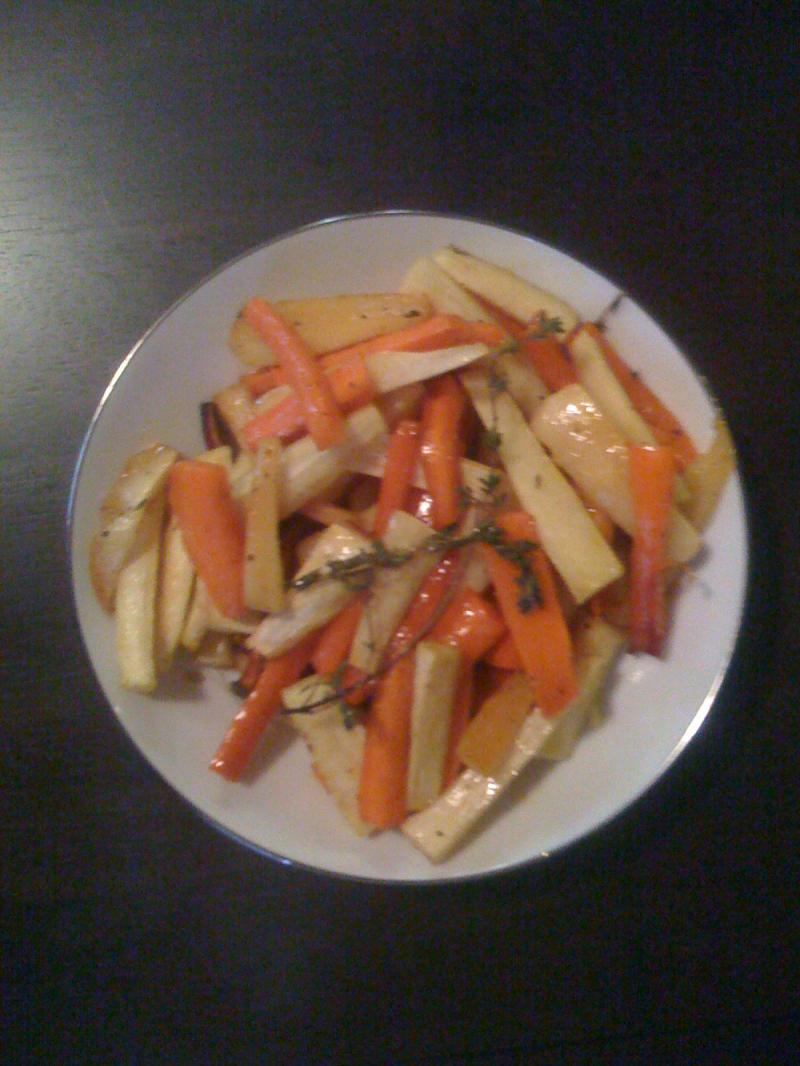 cut the parsnips and carrots similar size, put on cookie sheet. Drizzle oil and honey on top. Add a few sprigs of thyme and bake. I use 350 degrees for about 20 min (stab one with a fork to see if it is cooked).