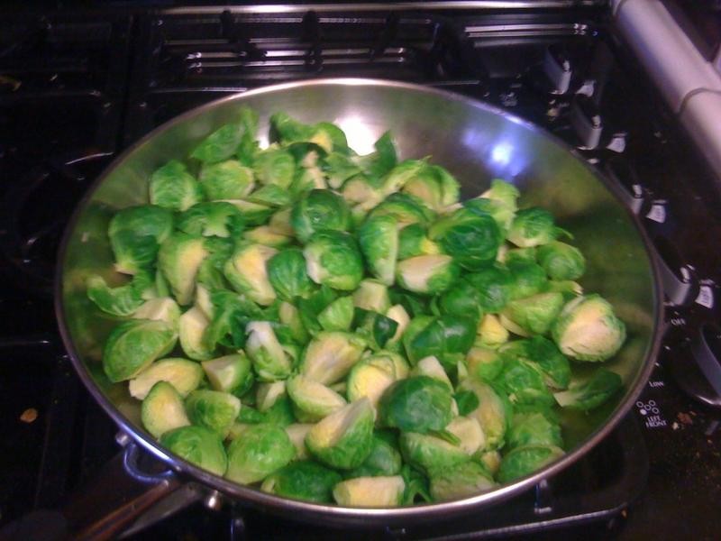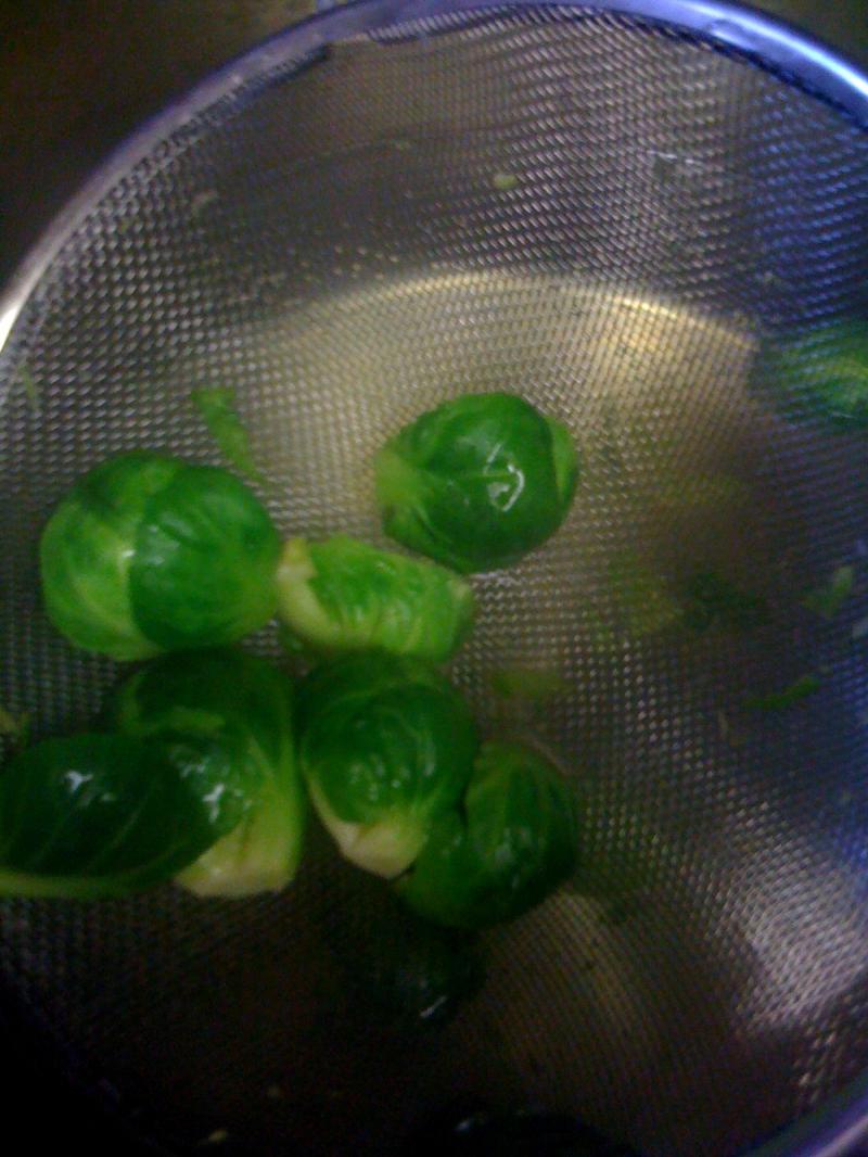 First, trim the bottoms off your brussle sprouts and then but them in half or quarters. When they are all cut, boil (blanche) them for about 30 seconds until they turn bright green